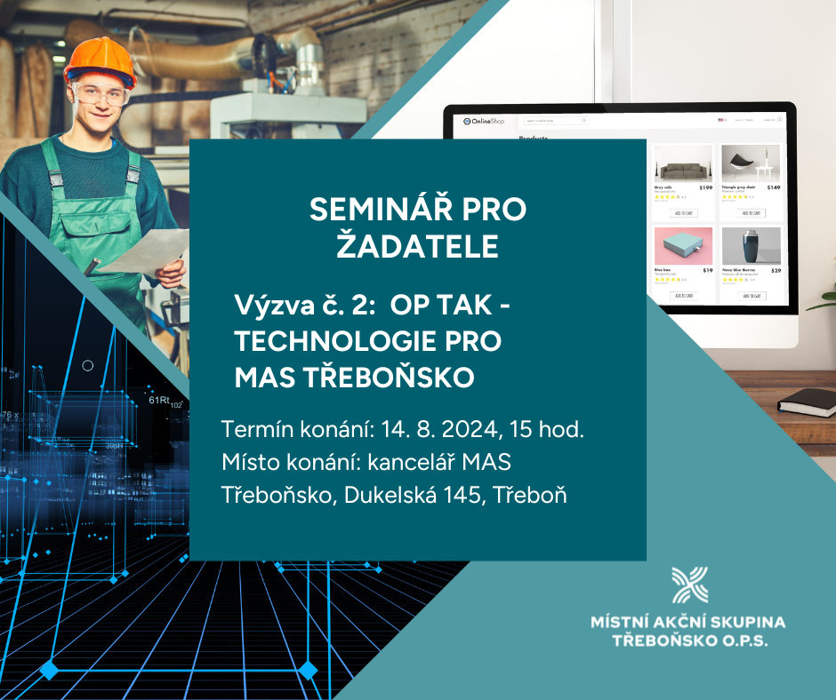 Seminář pro žadatele o účast v Operačním programu Technologie a aplikace pro konkurenceschopnost.Místní akční skupina Třeboňsko o.p.s. jako nositel Strategie komunitně vedeného místního rozvoje území MAS Třeboňsko pro období 2021–2027 informuje, že v červenci roku 2024 plánuje vyhlásit 2. VÝZVU OP TAK – TECHNOLOGIE PRO MAS TŘEBOŇSKO z Operačního programu Technologie a aplikace pro konkurenceschopnost.