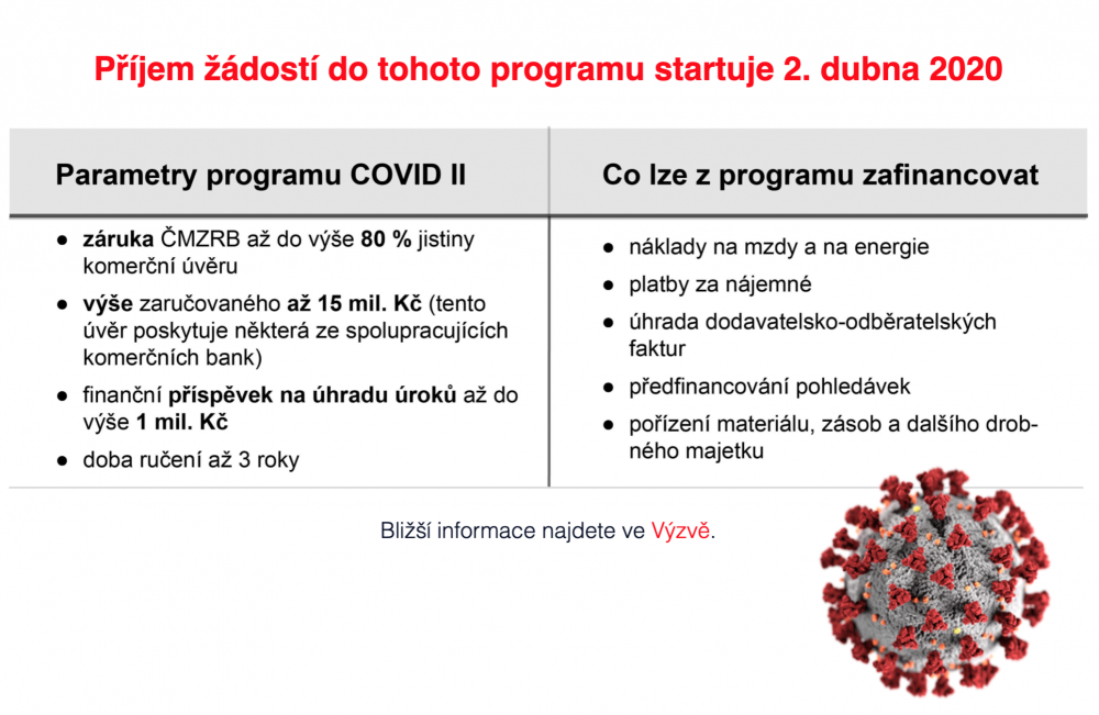 K dnešnímu dni vyhlásila Českomoravská záruční a rozvojová banka, a.s. záruční program COVID II.Žádosti do záručního programu COVID II budou přijímány od 2. dubna 2020. Záruční program COVID II usnadňuje přístup živnostníkům, malým a středním podnikatelům k provoznímu financování. Je určen pro podnikatelské subjekty, jejichž ekonomické aktivity jsou omezeny v důsledku výskytu koronavirové infekce a souvisejících preventivních opatření. Program je financován ze strukturálních fondů EU v rámci OPPIK. ČMZRB zveřejnila Žádosti a jejich přílohy budou přijímány pouze na oficiálních formulářích banky. Bližší informace k programu COVID II najdete ve Výzvě. Další informace k tomuto programu se v současné chvíli připravují.