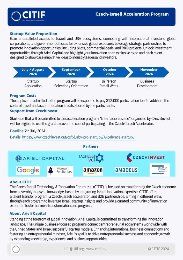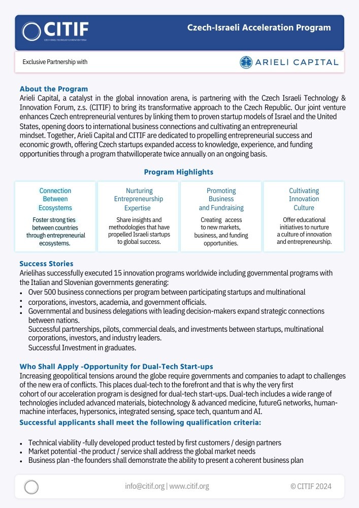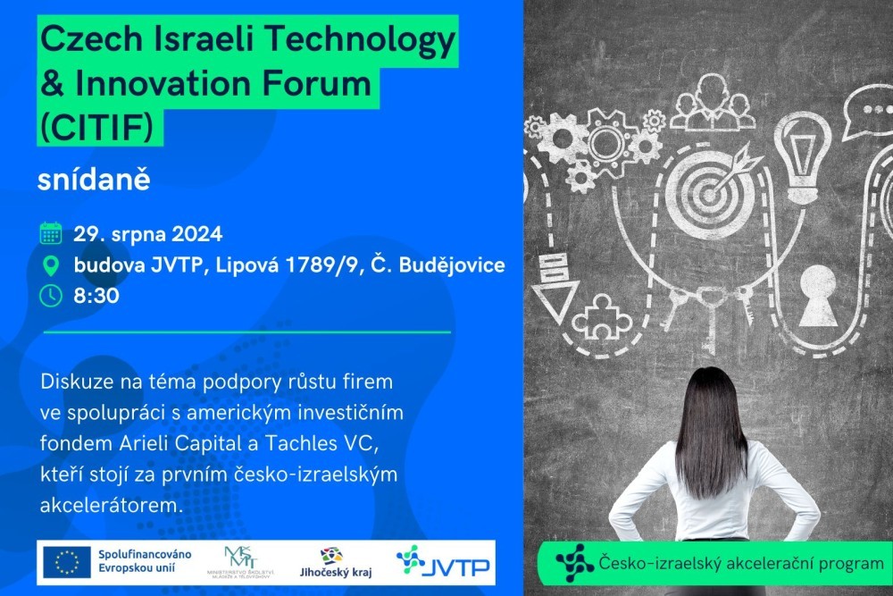 Česko-izraelský akcelerační program pod taktovkou Czech Israeli Technology & Innovation Forum (CITIF), investiční společnosti Arieli Capital a Tachles VC podpoří ambiciózní české startupy/scaleupy v globální expanzi.Rádi vás jménem Davida Marka a Karla Tuška zveme na snídani s Czech Israeli Technology & Innovation Forum (CITIF), která se uskuteční 29. srpna 2024 od 8:30 v budově JVTP.