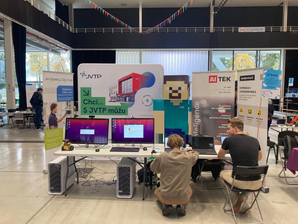Tuto sobotu proběhl na českobudějovickém výstavišti oblíbený Maker Faire, svátek tvořivosti, technologií a inovací — a my jsme byli u toho!Pod hlavičkou Jihoc Digi Hubu, ve spolupráci s AI TEK a jihočeskou platformou pro umělou inteligenci budejovice.ai, jsme návštěvníkům představili svět moderních digitálních technologií a praktické využití umělé inteligence v každodenním životě i podnikání.