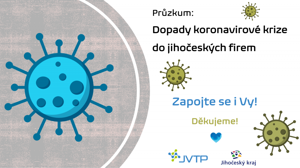 Jihočeský vědeckotechnický park, a.s. (JVTP) v úzké spolupráci s Jihočeským krajem připravují v těchto dnech systém pomoci malým a středním podnikům v regionu, jejichž aktivity byly omezeny v důsledku výskytu koronavirové infekce a souvisejících preventivních opatření. Rádi bychom Vás touto cestou požádali o pomoc s efektivním a účinným nastavením systému podpory, který bude reagovat na Vaše konkrétní potřeby.