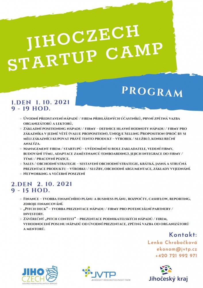 Přijďte si do JVTP užít dva intenzivní dny s vaším podnikatelským nápadem a odbornými mentory.Na této dvoudenní akci Jihoczech Startup Camp, které se bude konat v prostorách JVTP, v pátek a v sobotu, ve dnech 1. a 2. října 2021, se podíváte na váš podnikatelský nápad společně s odbornými mentory z mnoha úhlů pohledu a zasadíte jej tak snadno do vašeho budoucího business plánu.