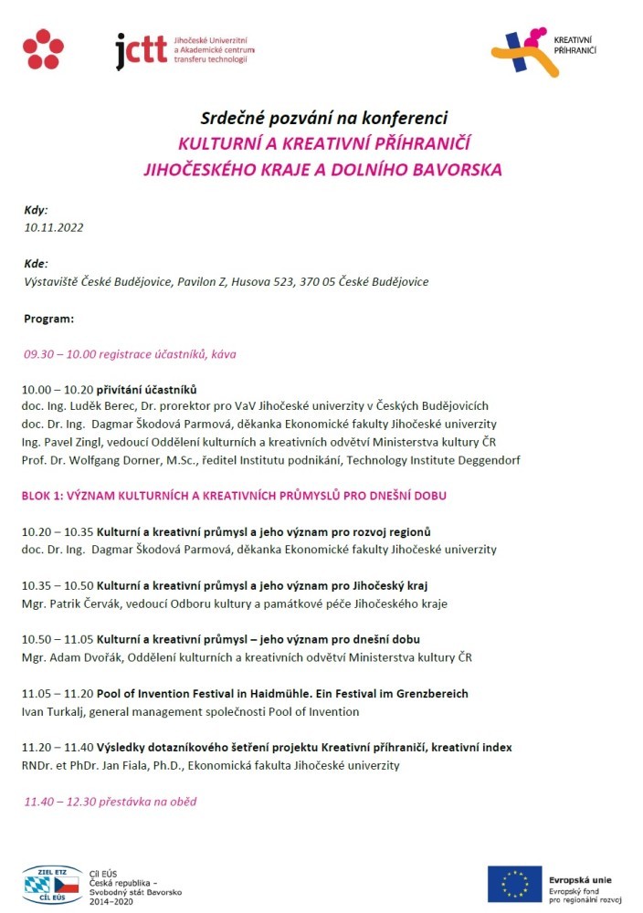 Přijměte naše srdečné pozvání na konferenci k tématu Kulturní a Kreativní příhraničí Jihočeského kraje a Dolního Bavorska.Kdy: 10. listopadu 2022, 9:30 - 10:00 registrace účastníků