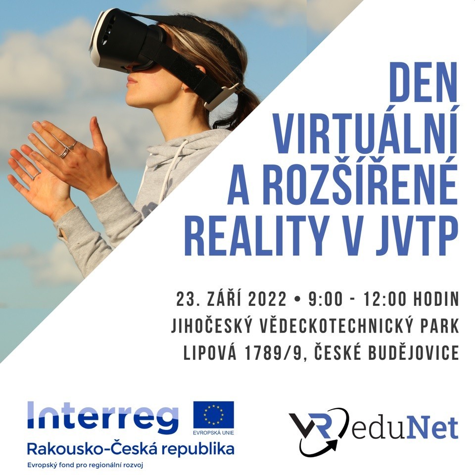 Zveme Vás do JVTP na Den virtuální a rozšířené reality, který se uskuteční dne 23.9.2022 od 9:00 v prostorách Jihočeského vědeckotechnického parku.Těšit se můžete na aktuální informace z česko-rakouského projektu VReduNet, představení nového vzdělávacího programu pro pedagogické pracovníky pomáhajícího zavádění virtuální a rozšířené reality do výuky na základních, středních školách a vysokých školách, praktické zkušenosti jihočeských škol s využitím VR při práci se studenty, možnosti využití technologie ve firemním prostředí a názorné ukázky aplikací ve virtuální a rozšířené realitě na různých místech objektu vědeckotechnického parku.
