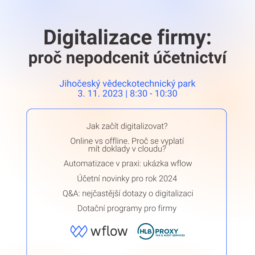 Chcete vědět, jak efektivně začít digitalizovat účetní procesy, nebo jaké účetní novinky se chystají na rok 2024? Tak toto je událost přesně pro Vás!Zveme vás na oborovou snídani, kterou pořádá firma wflow ve spolupráci s účetní kanceláří Proxy a podporou Jihočeského vědeckotechnického parku.