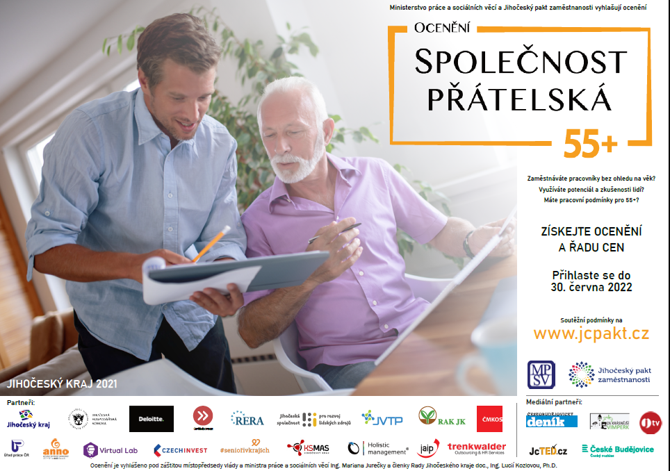 Termín podání přihlášek do soutěže Společnost přátelská zaměstnávání 55+, byl prodloužen do konce července 2022.Stárnutí populace a našich zaměstnanců se stává prioritou číslo jedna do následujících let, a proto, čím dříve se začneme tímto tématem zabývat, tím získáme, a především naši zaměstnavatelé a jejich zaměstnanci, konkurenční výhodu. Pokud jste zaměstnavatel, který přijímá pracovníky bez ohledu na věk, podporuje mezigenerační spolupráci a zohledňuje pracovní podmínky i s ohledem na věk, tak právě Vaše společnost se může stát vítězem a získat prestižní cenu.