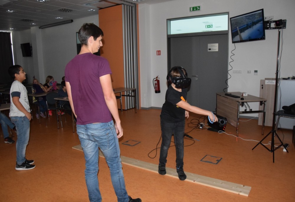 Do třetice byl pro žáky připraven vstup do interaktivního prostředí virtuální reality, kterou si mohli na vlastní kůži vyzkoušet. Virtuální realita je technologie umožňující interagovat uživatele se simulovaným prostředím vytvořením iluze skutečného nebo fiktivního světa pomocí počítače a speciálních audiovizuálních brýlí. Pomocí technologie byly pro děti připraveny zábavné a relaxační programy, což je jedno ze širokého spektra využití VR. Dále je možno virtuální realitu uplatnit například oblastech v lékařství, při léčbě fobií, v rámci práce se strachem, syndromem vyhoření, ve sportu či v armádě.