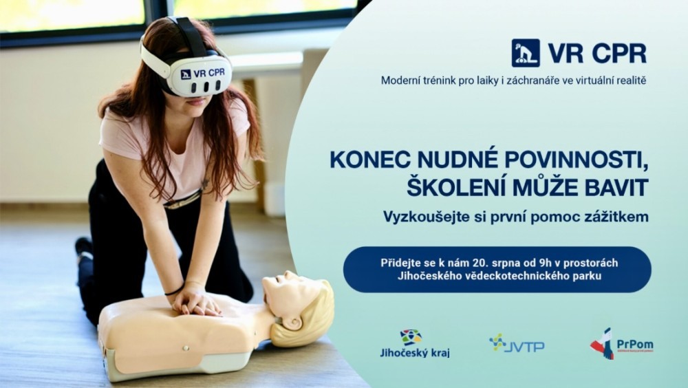 Moderní trénink pro laiky i záchranáře ve virtuální realitě.Virtual Lab, JVTP a PrPom představují moderní školení pro moderní firmy. Přidejte se k nám 20. srpna od 9:00 v prostorách JVTP – přineste do své firmy trénink, který dodá lidem odvahu poskytnout účinnou pomoc.