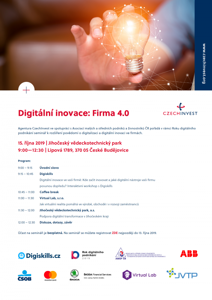 Dne 15. října od 9:00 se v prostorách Jihočeského vědeckotechnického parku v Českých Budějovicích uskuteční seminář Digitální inovace: Firma 4.0, který pořádá agentura CzechInvest ve spolupráci s Asociací malých a středních podniků a živnostníků ČR v rámci Roku digitálního podnikání.Během dopoledne budete mít možnost dozvědět se více o novinkách z oblasti digitalizace. V rámci workshopu od společnosti Digiskills zjistíte, jak můžete Vaše podnikání díky zavedením prvků digitalizace a chytrých technologií posunout zase o kousek dál. Společnost Virtual lab Vám představí využití virtuální reality nejen ve výrobě a Jihočeský vědeckotechnický park svůj nový projekt Jihočeský Digi Hub.