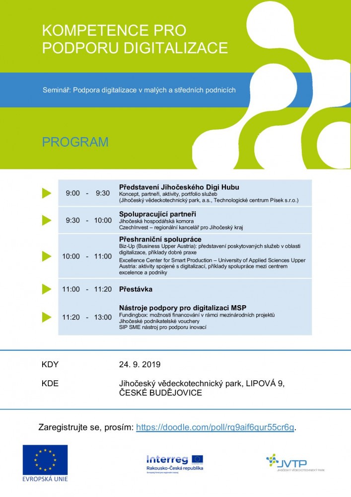 Dne 24.9.2019 se v prostorách JVTP uskuteční setkání k tématu Podpora digitalizace v malých a středních podnicích. Setkání je pořádáno Jihočeským Digi Hubem v rámci projektu "Kompetence pro podporu digitalizace" financovaného z Fondu malých projektů Rakousko - Česká republika v rámci programu Interreg V-A Rakousko - Česká republika.Účast na semináři je bezplatná, seminář je určen jak malým a středním podnikům, tak velkým firmám, podpůrným organizacím a dalším.