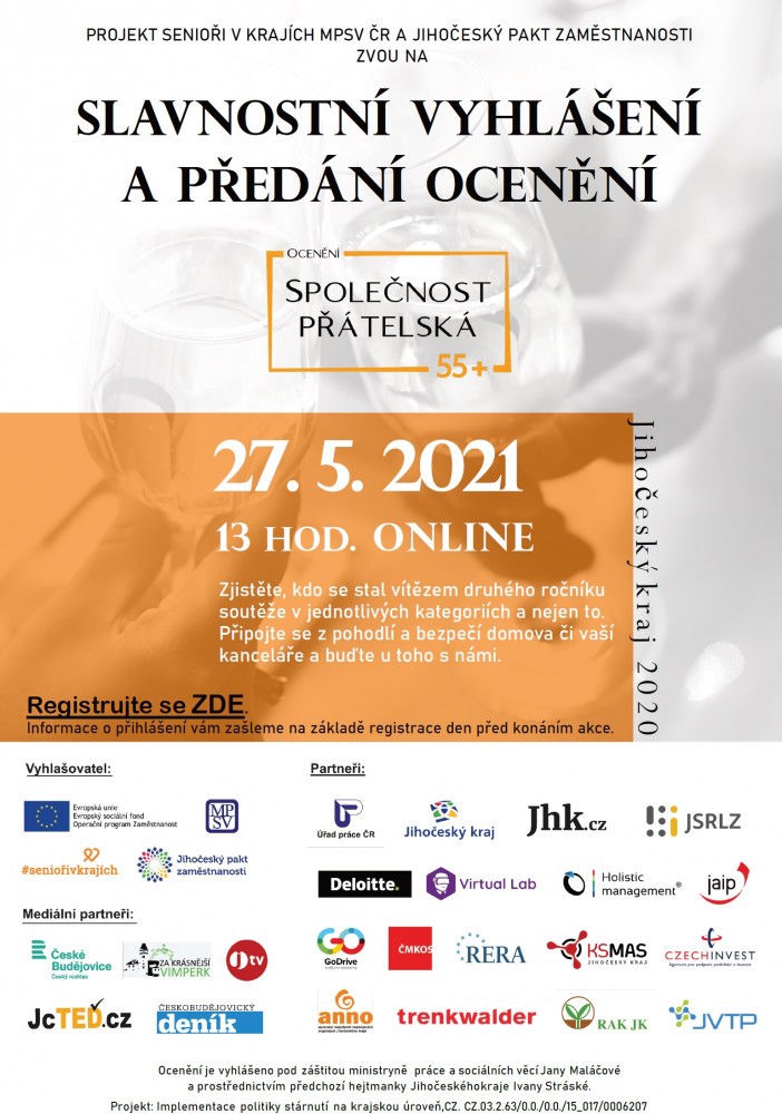 Pozvánka na slavnostní vyhlášení a předání ocenění "SPOLEČNOST PŘÁTELSKÁ ZAMĚSTNÁVÁNÍ OSOB 55+".Dne 27.5.2021 od 13:00 proběhne online vyhlášení vítěze druhého ročníku soutěže v jednotlivých kategoriích.