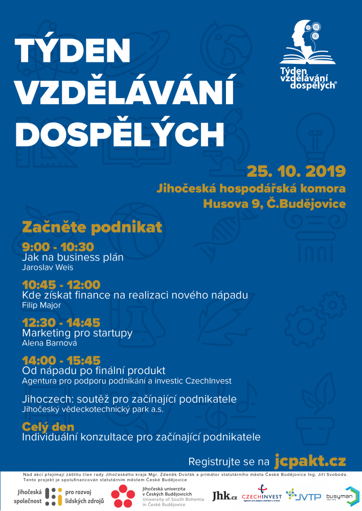 Vyberte si a přijďte si vyzkoušet na vlastní kůži virtuální realitu, vizuální myšlení nebo jak napsat Váš business plán a kde na něj získat finance. Tématu Začněte podnikat bude věnován celý páteční den tj 25.10.2019, kdy jednotlivé workshopy/semináře budou probíhat v sídle Jihočeské hospodářské komory, Husova 9, České Budějovice.