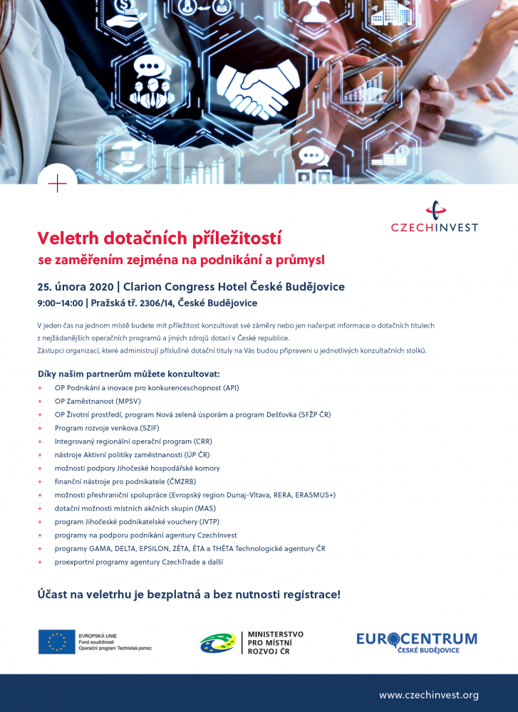 Agentura Czechinvest pořádá 4. ročník Veletrhu dotačních příležitostí se zaměřením na podnikání a průmysl. Na veletrhu bude možné konzultovat podnikatelské záměry a načerpat informace o dotačních titulech z nejžádanějších operačních programů a jiných zdrojů dotací v České republice.