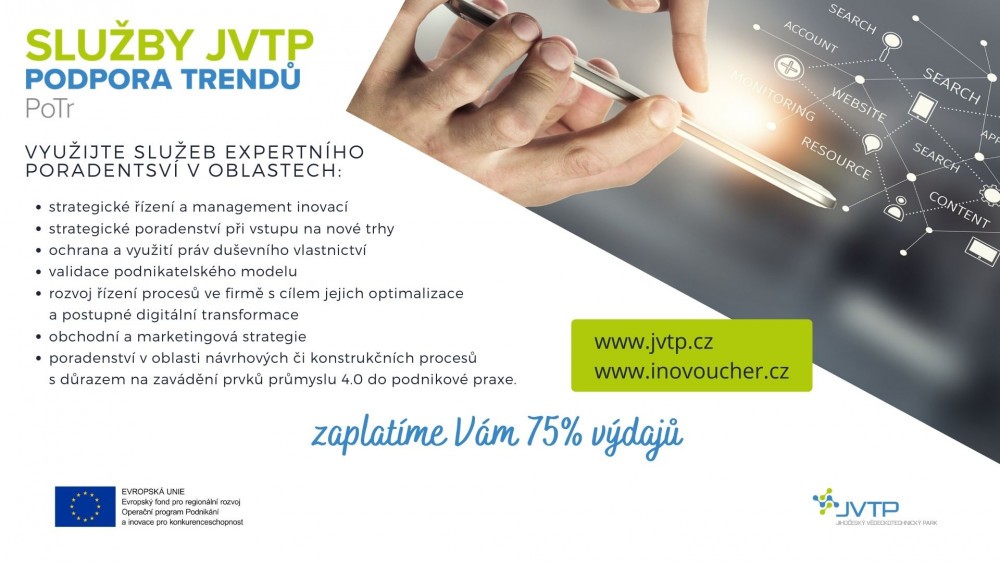 Tuto podporu pro jihočeské podnikatele poskytuje Jihočeský vědeckotechnický park, a.s. (JVTP) díky projektu s názvem Služby JVTP – Podpora Trendů (PoTr), který je financován z Operačního programu Podnikání a inovace pro konkurenceschopnost, programu Služby infrastruktury.