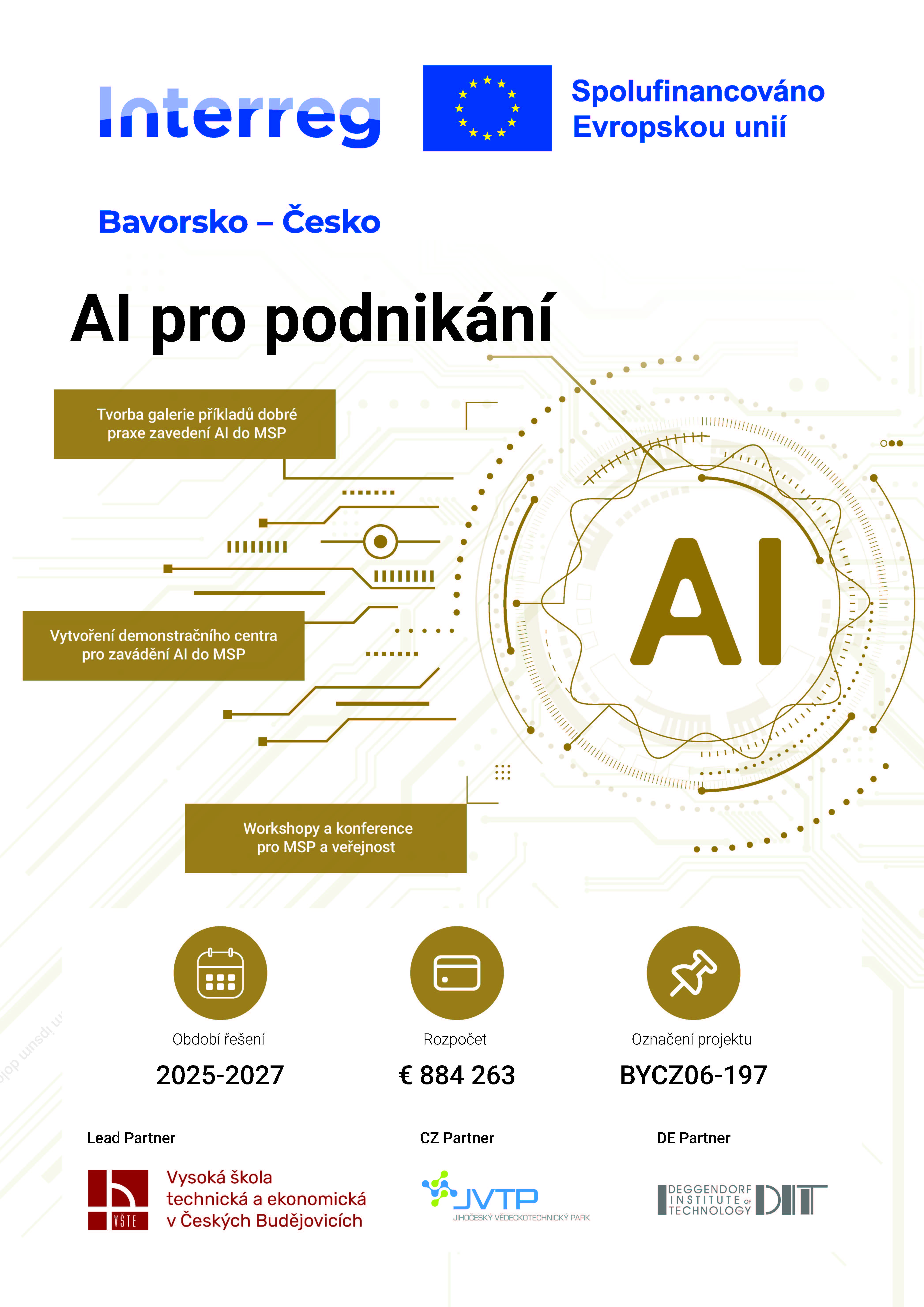 Cíl projektu: V partnerských příhraničních regionech je využívání umělé inteligence (AI) výrazně nižší než v jiných, částečně i z důvodu nedostatku kvalifikované pracovní síly. Nedochází k dostatečnému transferu AI technologií z vědeckovýzkumných institucí (VVI) k malým a středním podnikům (MSP) a obecně je nižší informovanost o současných možnostech a přínosech AI. Cílem projektu je proto přenos znalostí o využití AI z vědeckovýzkumné oblasti k MSP zejména prostřednictvím workshopů. AI technologie pomohou MSP automatizovat a optimalizovat širokou škálu provozních procesů, počínaje výrobou a kontrolou kvality přes logistiku až po služby zákazníkům, sníží tak jejich náklady a zvýší konkurenceschopnost. Partneři projektu pokrývají potřebné oblasti, které projekt řeší: VŠTE je expertem na AI a procesní analýzu, THD je expertem na AI a škálování technologií a JVTP je expertem na práci s MSP. V rámci projektu budou probíhat odborné workshopy určené zejména pro MSP, ale i pro širokou veřejnost a vědeckovýzkumné instituce. Workshopy budou podpořené galerií příkladů dobré praxe a praktickými ukázkami AI technologií v demonstračních centrech.